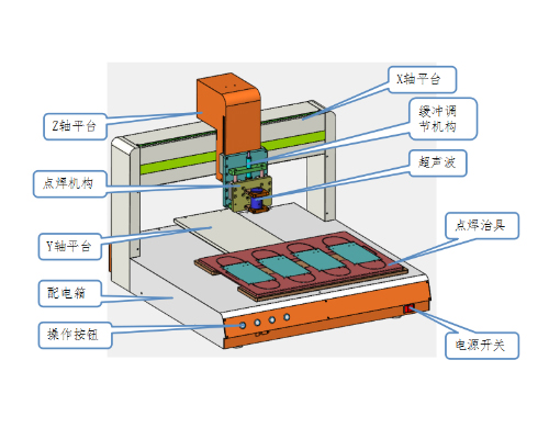 3.超聲波移動至點(diǎn)焊位置進(jìn)行點(diǎn)焊,點(diǎn)焊完成,人手取料,完成一個(gè)循環(huán)。
